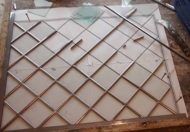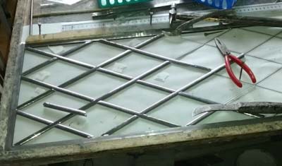 way courses of bricks are arranged in a wall. Narrow thin steel strips may be concealed within the lead, edgewise to the glass to add rigidity. External support bars are also commonly added, set into the frame and 'hiding' behind lead
